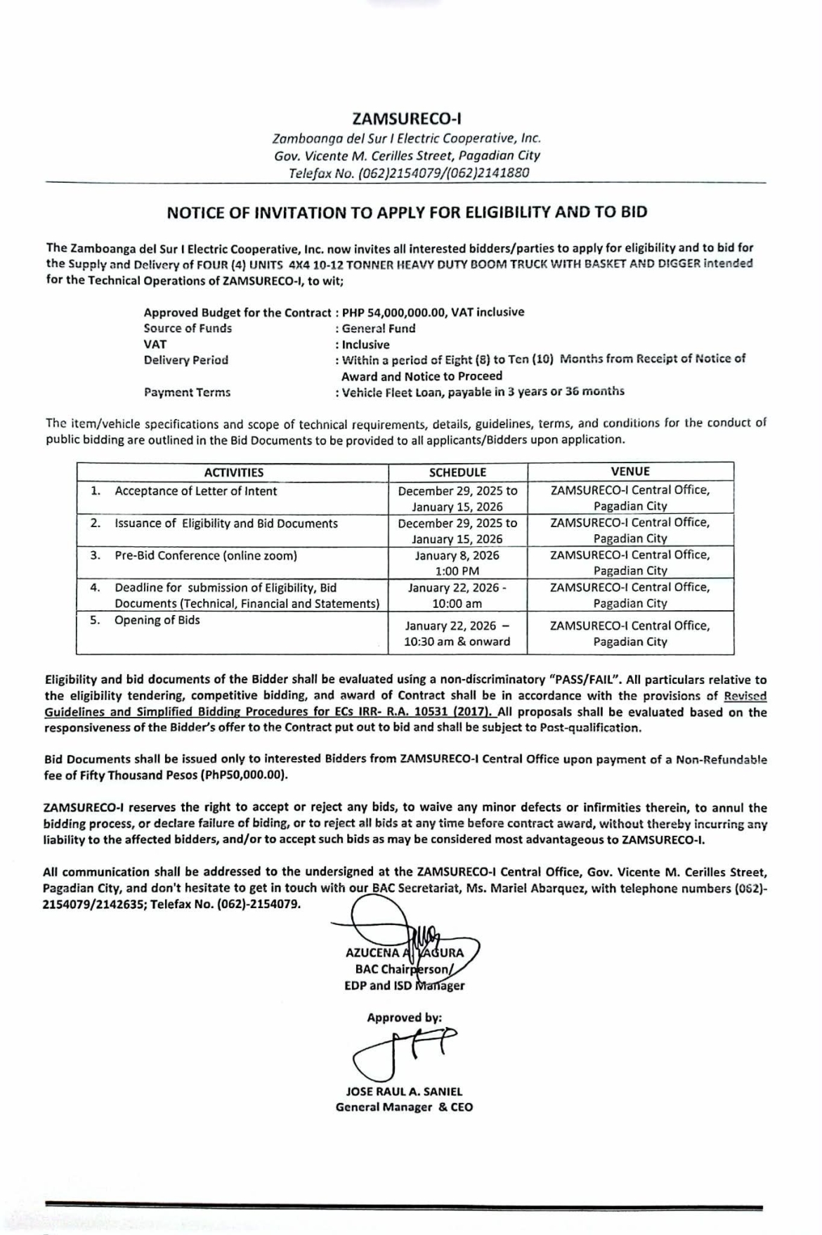 NOTICE OF INVITATION TO APPLY FOR ELIGIBILITY AND TO BID for the Supply and Delivery of 4 unit Tonner Heavy Boom Truck with basket and Digger intended for technical operations of ZAMSURECO-I.