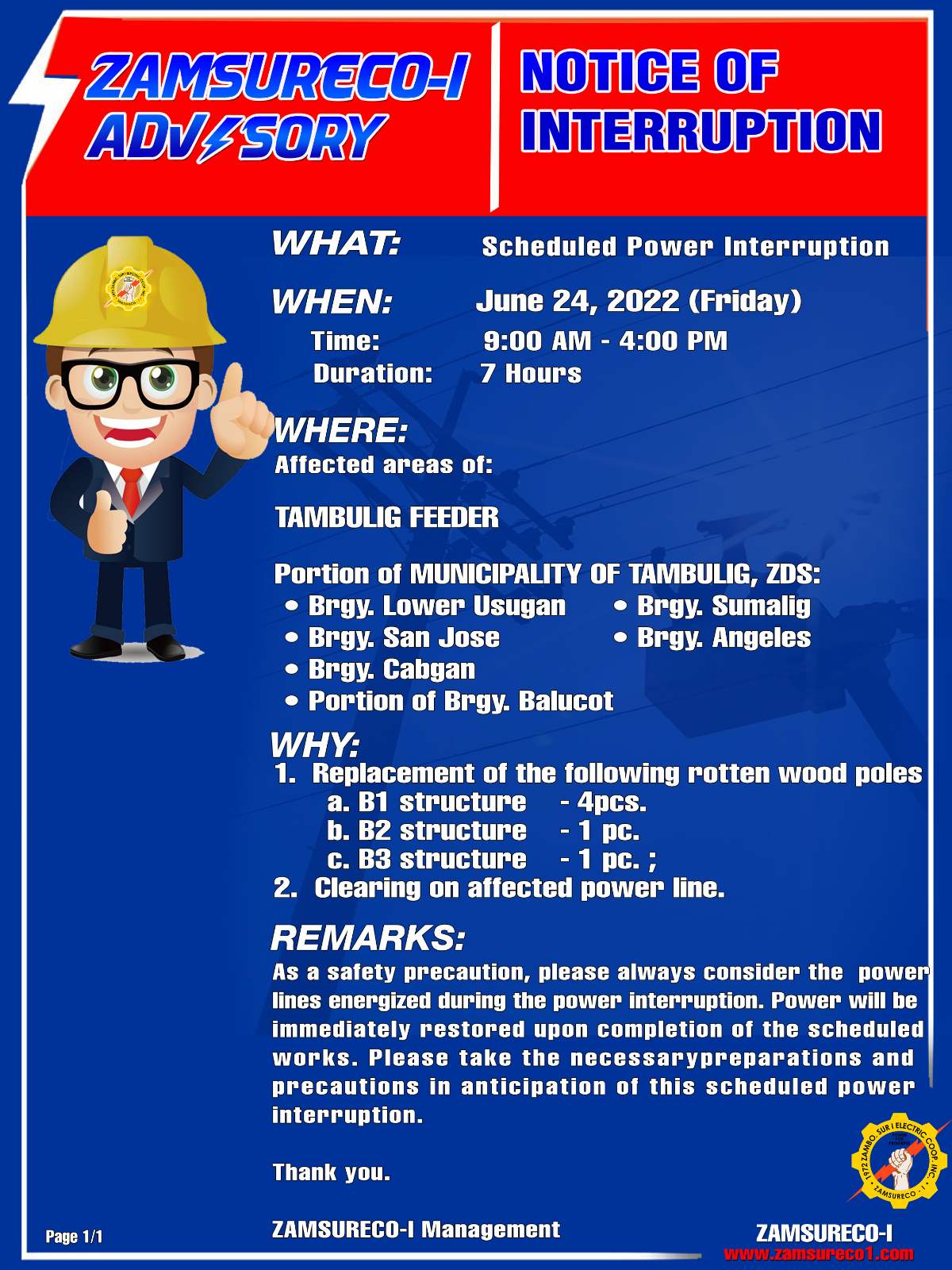 As a safety precaution, please always consider the power lines energized during the power interruption. Power will be immediately restored upon completion of the scheduled works. Please take the necessary preparations and precautions in anticipation of this scheduled power interruption.